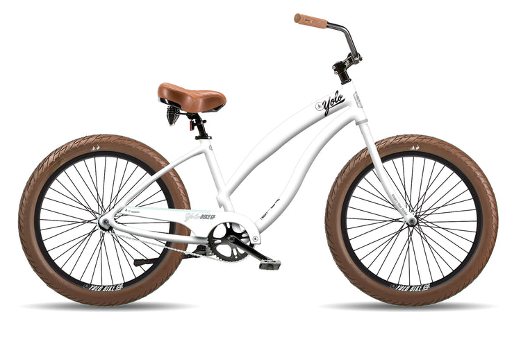 AVALAILABLE FOR PRE-ORDER! ARRIVING MID-JUNE, with Brown Tires, Brown Seat and Brown Grips. The YOLO Bike 3" Fat Tire Beach Cruiser is a classic cruiser bike that's perfect for casual riding. Whether you're riding around town, by the beach, or on the bike path, this bike will get you there in style! The idea of this bike was to keep it simple: single speed and a coaster brake that engages simply by pedaling backwards, just like the old-school beach cruisers it was inspired by. The alloy frame is lightweight and rust-resistant, while the 3" tire and comfort saddle are designed to absorb shock - ensuring a smooth, enjoyable ride. YOLO Bike manufactures some of the best beach cruiser bikes on the market featuring high-end components and specs that are unmatched by competitors in the same price category. YOLO Bikes include a one-year manufacturer's warranty. YOLO Only Live Once - Enjoy the Ride!